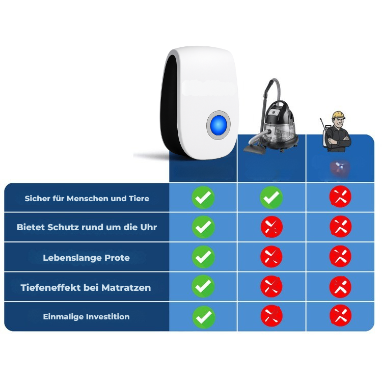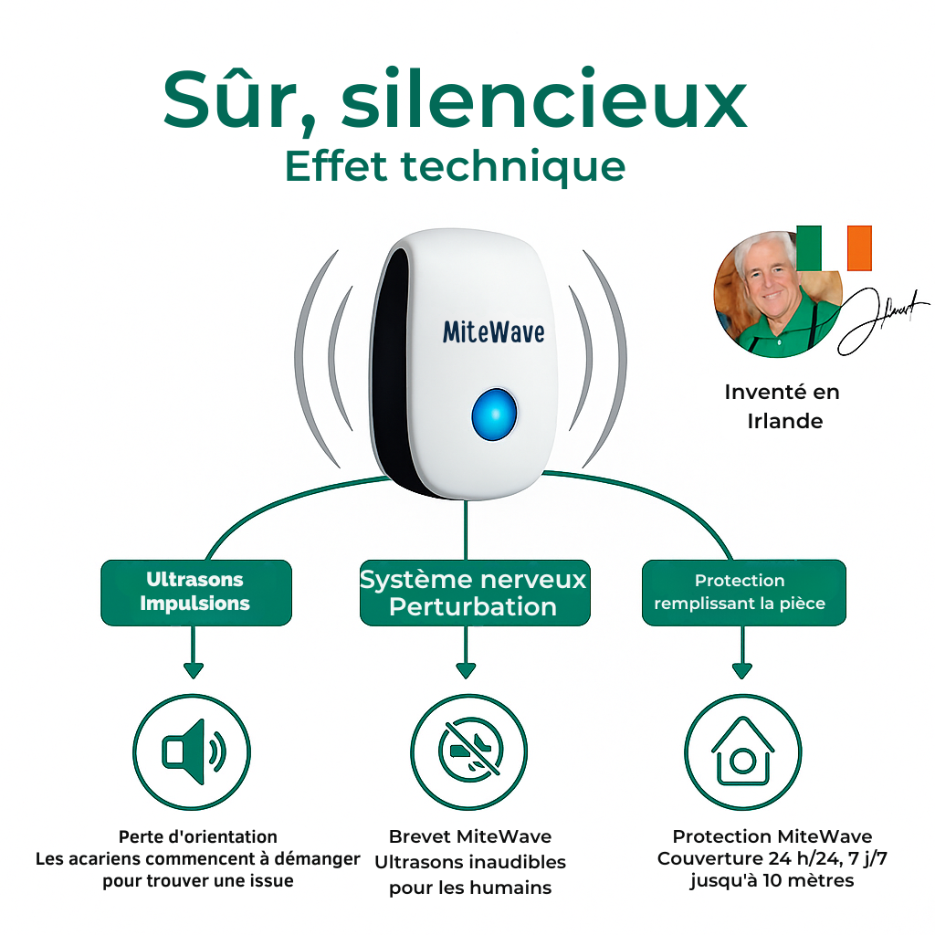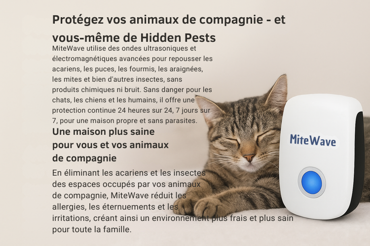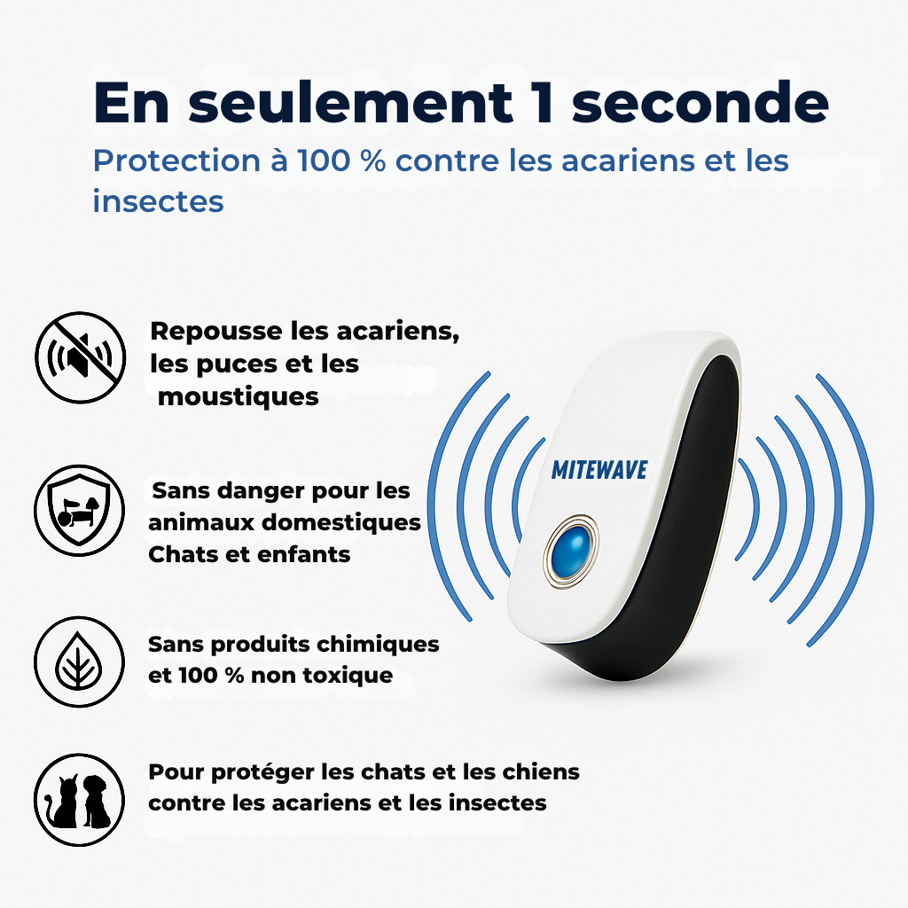 Protégez votre maison contre les acariens, les rats, les souris, les araignées, les fourmis, les mites, les lépismes et autres insectes grâce à MiteWave, le répulsif ultrasonique nouvelle génération. Grâce à une technologie avancée à ultrasons et ondes électromagnétiques, il éloigne naturellement les nuisibles, sans produits chimiques, sans toxines et sans bruit. Profitez d'une maison plus propre, plus sûre et plus confortable pour toute votre famille.
